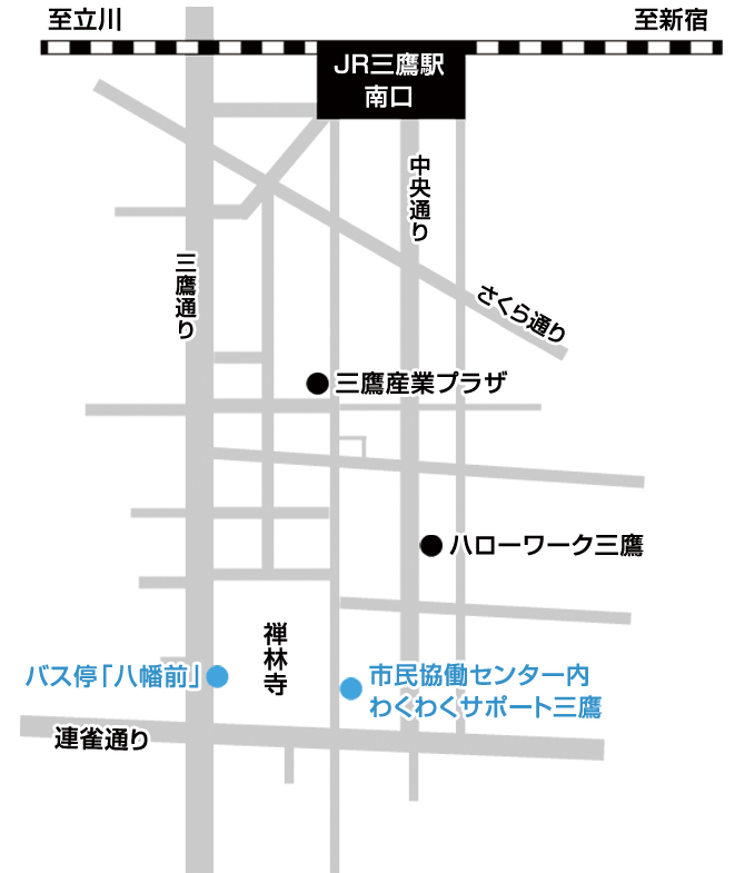 〒181-0013 三鷹市下連雀4-17-23 三鷹市市民協働センター内 電話:0422-45-8645 FAX: 0422-45-8646